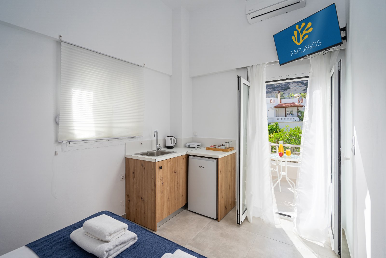 ΦΑΡΟΣ — 2 επισκέπτες 16 τ.μ. 1 διπλό κρεβάτι ΠΑΡΟΧΕΣ — Ολόκληρο στούντιο Ιδιωτική μικρή κουζίνα Ιδιωτικό μπάνιο Θέα στο βουνό Τηλεόραση επίπεδης οθόνης Μπαλκόνι Δωρεάν WiFi Κλιματισμό Κουζίνα Ψυγείο Ηλεκτρικός βραστήρας Κουζινικά σκεύη Εστίες Μπάνιο Προϊόντα περιποίησης Ντους Πετσέτες Στεγνωτήρας μαλλιών Χαρτί υγείας Κανονισμοί καταλύματος 1. Check-in, Από 3:00 μ.μ. έως 6:00 μ.μ. Θα πρέπει να ενημερώσετε το κατάλυμα εκ των προτέρων τι ώρα θα φτάσετε. 2. Check-out Από 8:00 π.μ. έως 11:00 π.μ. 3. Κανόνες Σπιτιού Απαγορεύεται το κάπνισμα στους εσωτερικούς χώρους Τα κατοικίδια δεν επιτρέπονται Δεν επιτρέπονται τα πάρτι ή/και οι εκδηλώσεις Εξασφαλίστε τη Διαμονή σας — Δείτε άμεσα τις διαθέσιμες ημερομηνίες και εξασφαλίστε τη διαμονή σας εύκολα και γρήγορα, στα Faflagos Apartments, μόλις λίγα βήματα από τη θάλασσα. KANTE ΚΡΑΤΗΣΗ