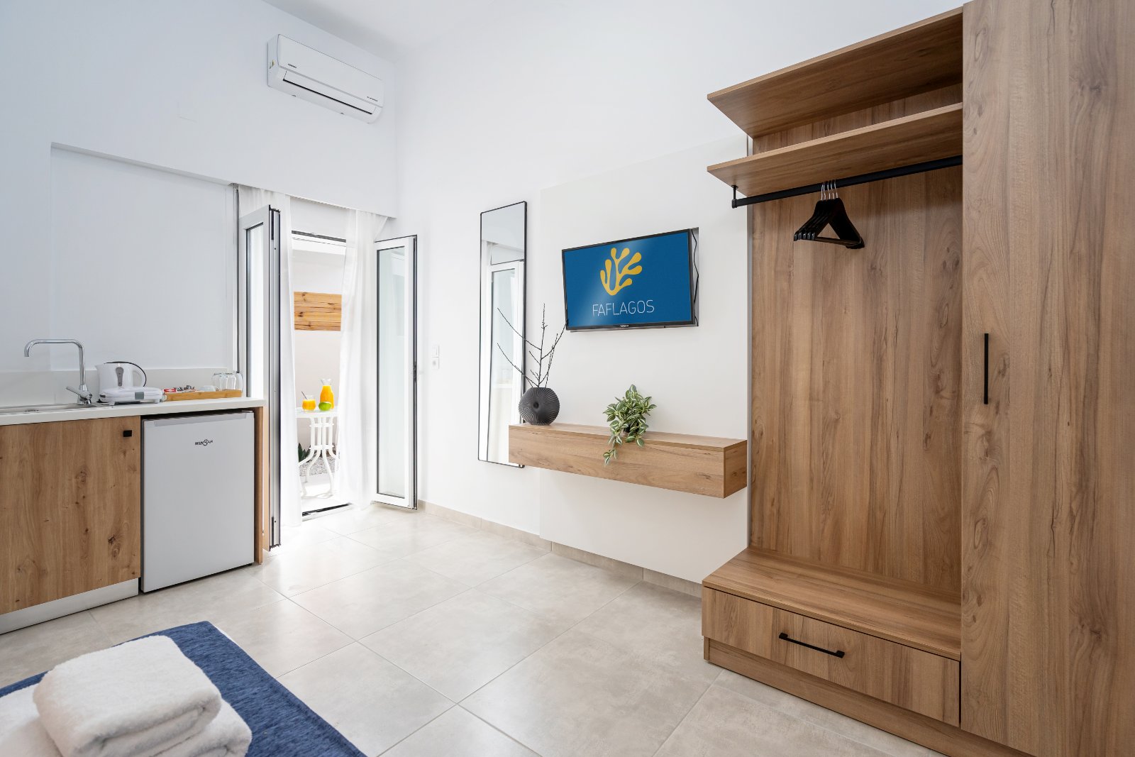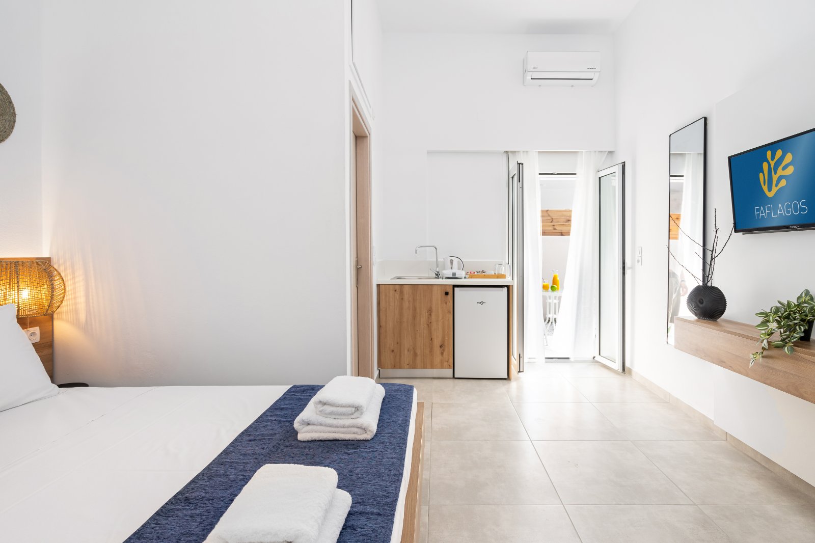 ΚΑΛΑΜΙ — 2 επισκέπτες 19 τ.μ. 1 διπλό κρεβάτι ΠΑΡΟΧΕΣ — Ολόκληρο studio Ιδιωτική μικρή κουζίνα Ιδιωτικό μπάνιο Θέα στο Βουνό Θέα στον κήπο Τηλεόραση επίπεδης οθόνης Βεράντα Δωρεάν WiFi Κλιματισμό Κουζίνα Ψυγείο Ηλεκτρικός βραστήρας Κουζινικά σκεύη Εστίες Μπάνιο Προϊόντα περιποίησης Ντους Πετσέτες Στεγνωτήρας μαλλιών Χαρτί υγείας Κανονισμοί καταλύματος 1. Check-in, Από 3:00 μ.μ. έως 6:00 μ.μ. Θα πρέπει να ενημερώσετε το κατάλυμα εκ των προτέρων τι ώρα θα φτάσετε. 2. Check-out Από 8:00 π.μ. έως 11:00 π.μ. 3. Κανόνες Σπιτιού Απαγορεύεται το κάπνισμα στους εσωτερικούς χώρους Τα κατοικίδια δεν επιτρέπονται Δεν επιτρέπονται τα πάρτι ή/και οι εκδηλώσεις Εξασφαλίστε τη Διαμονή σας — Δείτε άμεσα τις διαθέσιμες ημερομηνίες και εξασφαλίστε τη διαμονή σας εύκολα και γρήγορα, στα Faflagos Apartments, μόλις λίγα βήματα από τη θάλασσα. KANTE ΚΡΑΤΗΣΗ
